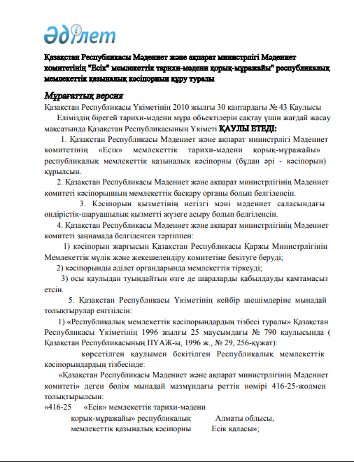 Қазақстан Республикасы Мәдениет және ақпарат министрлігі Мәдениет комитетінің «Есік» мемлекеттік тарихи-мәдени қорық-мұражайы» республикалық мемлекеттік қазыналық кәсіпорнын құру туралы Қазақстан Республикасы Үкіметінің 2010 жылғы 30 қаңтардағы № 43 Қаулысы