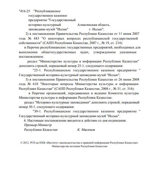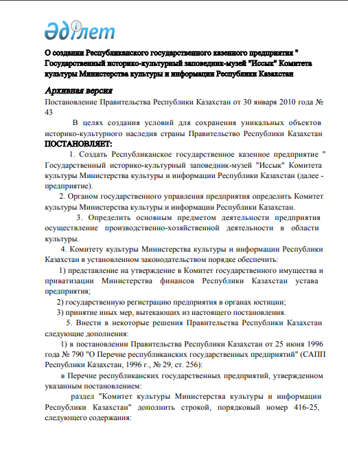О создании Республиканского государственного казенного предприятия » Государственный историко-культурный заповедник-музей «Иссык» Комитета культуры Министерства культуры и информации Республики Казахстан